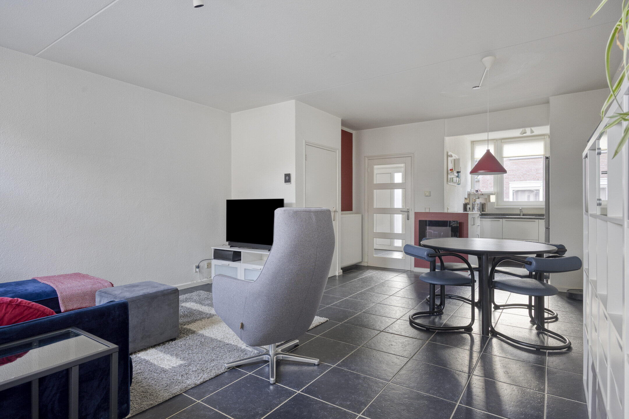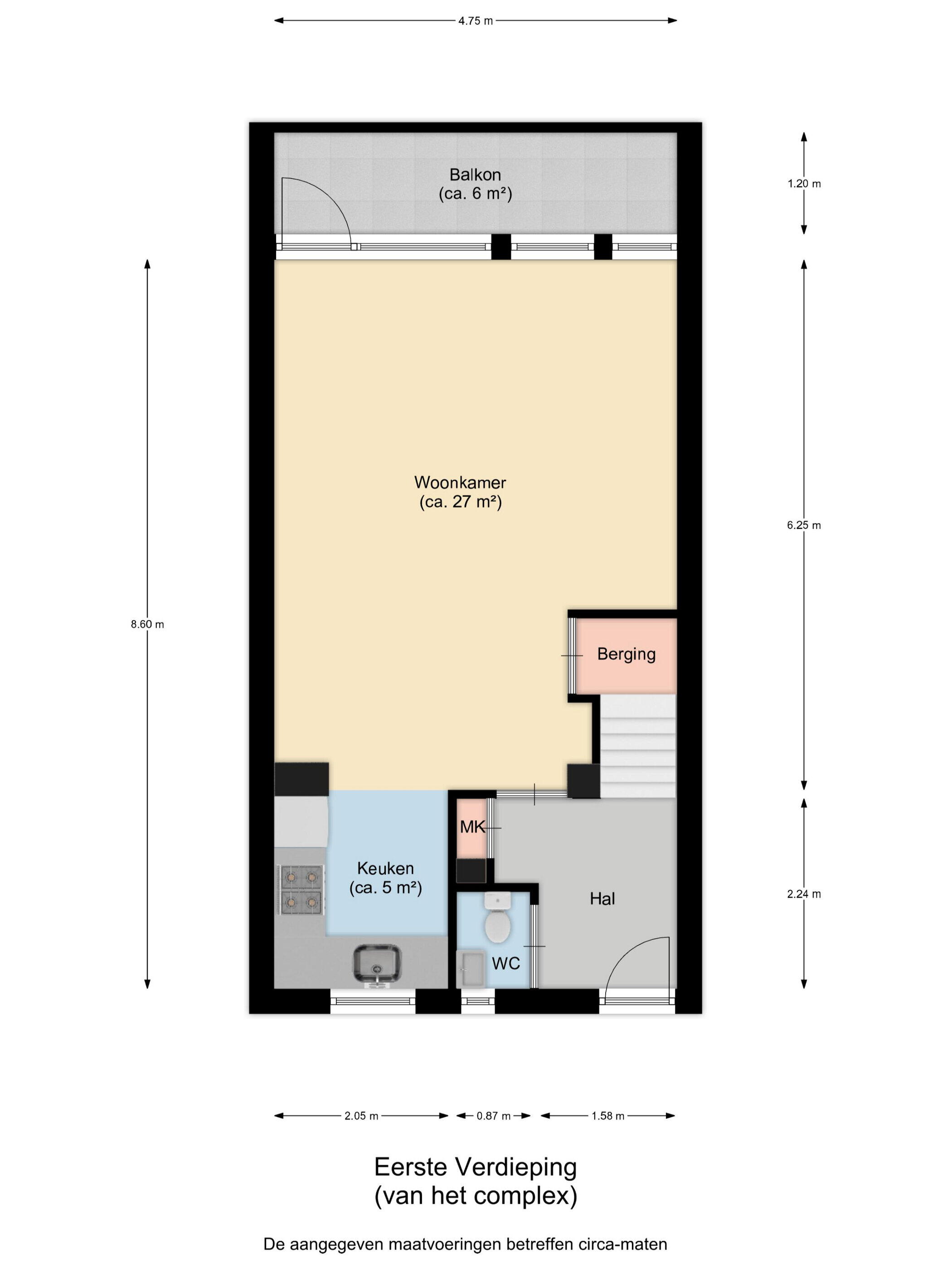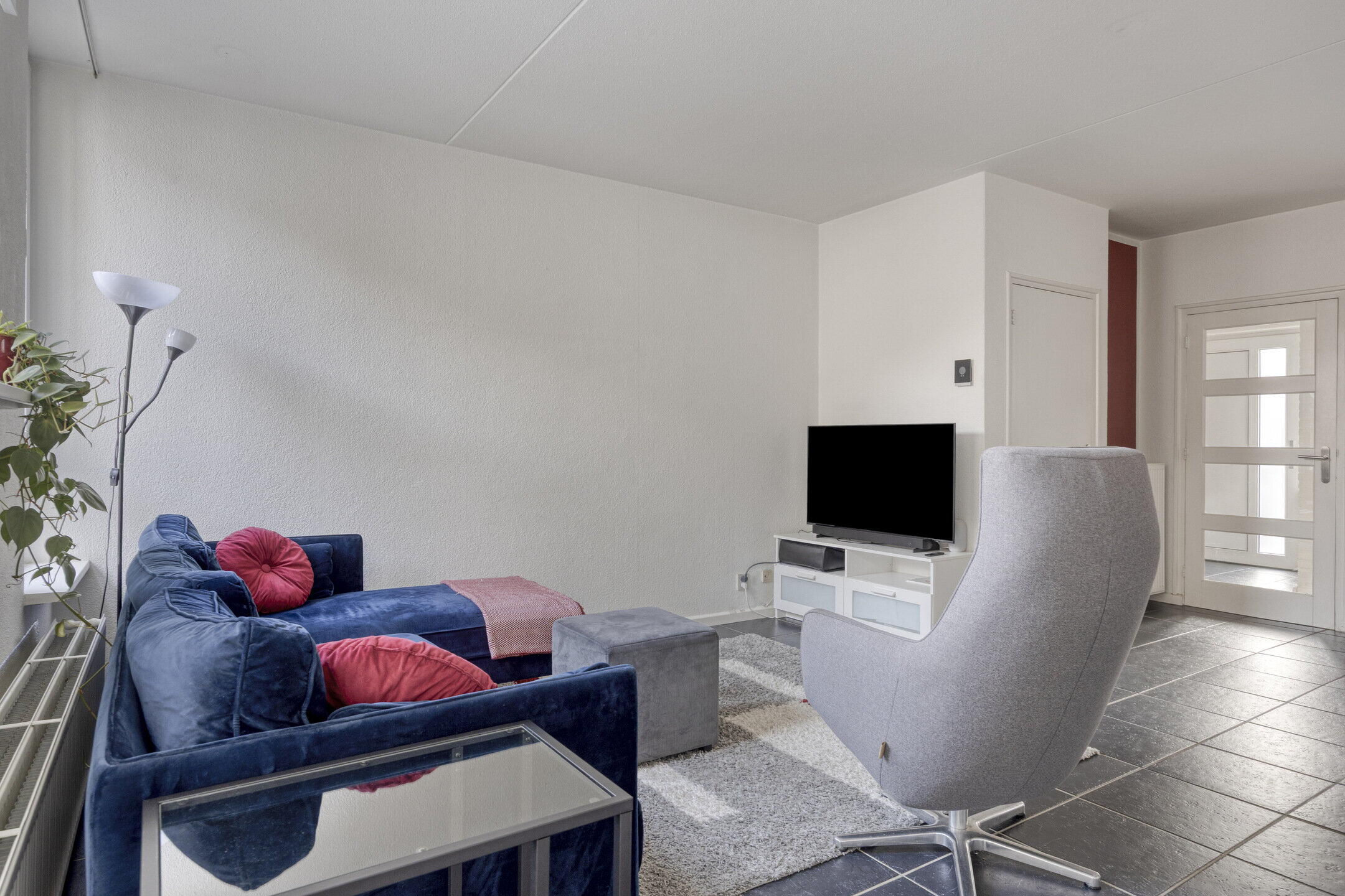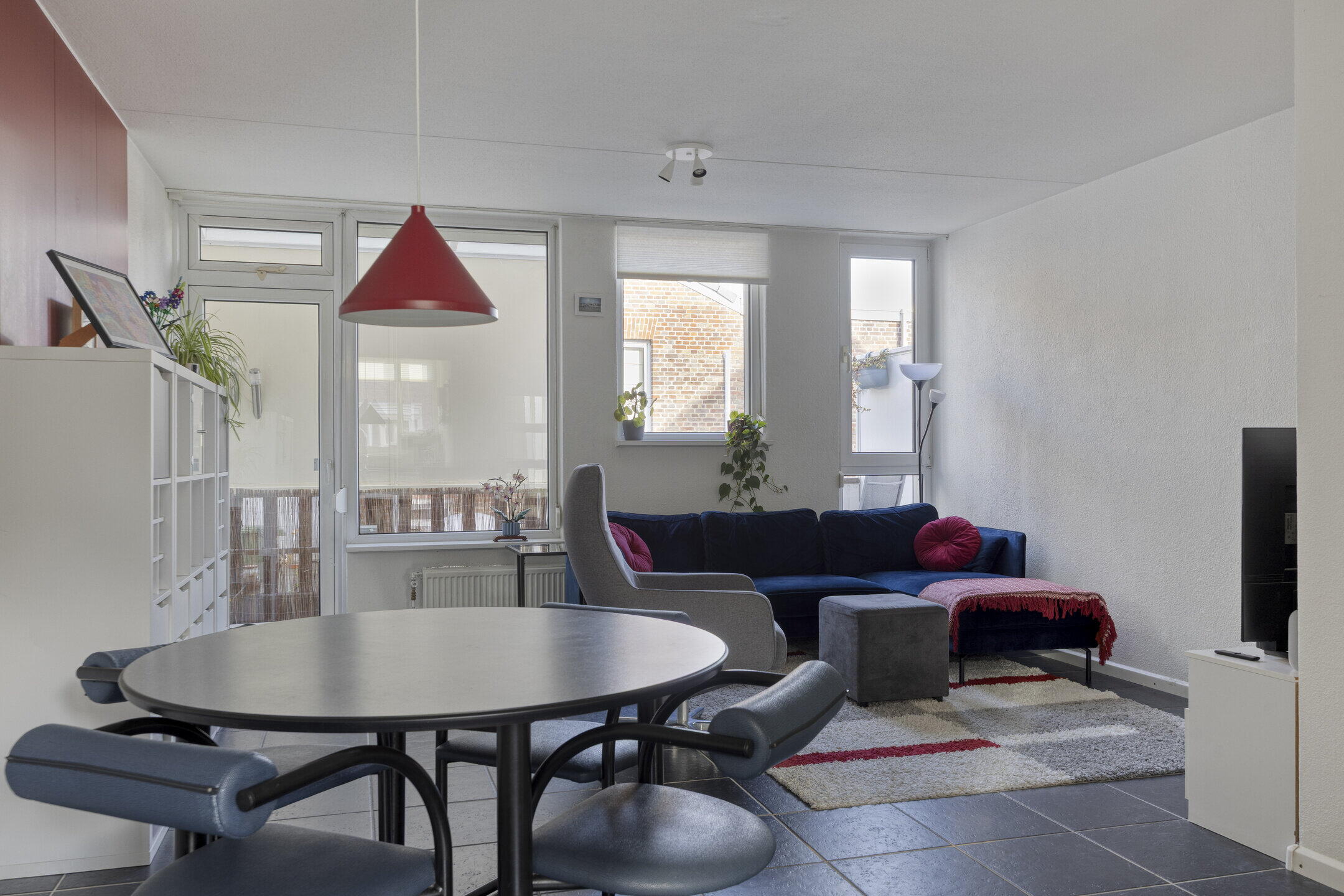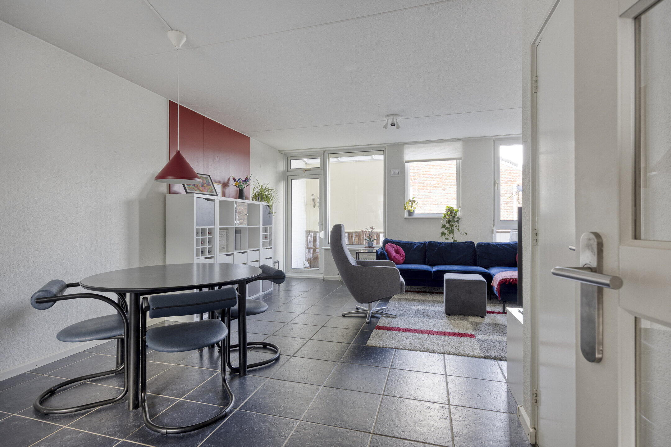 - Woonkamer (ca. 27 m²) met trapkast, open keuken en deur naar het balkon;