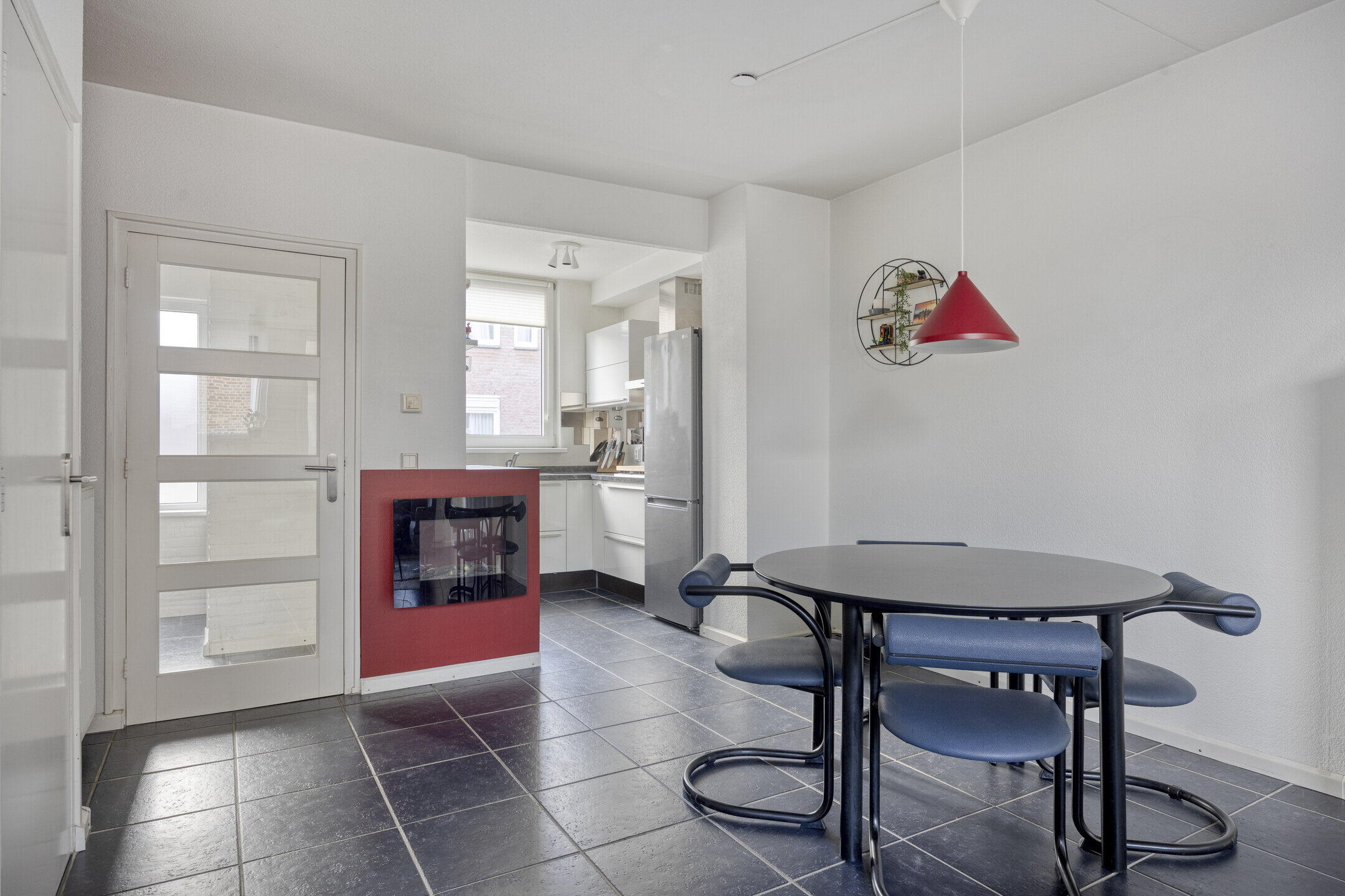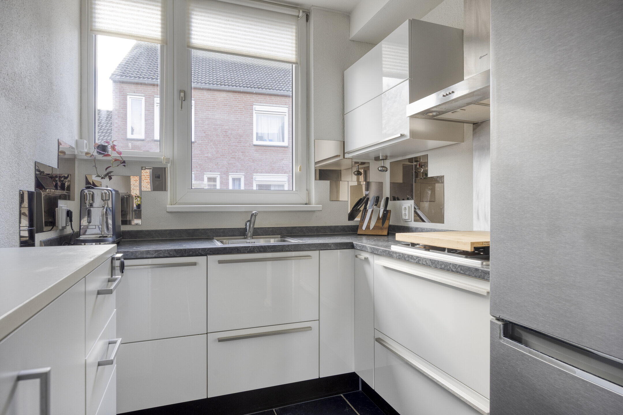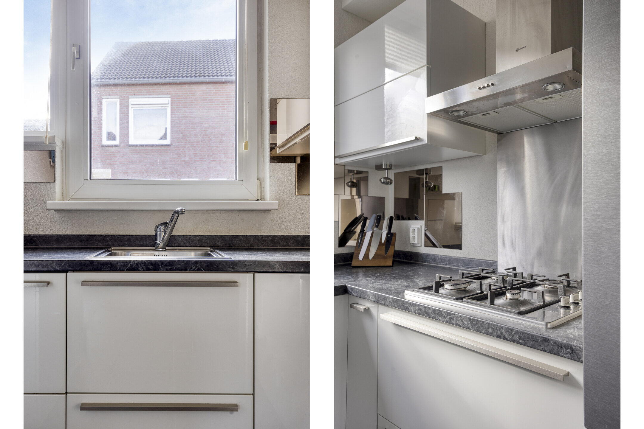 - Open keuken (ca. 5 m²) met moderne L-vormige keukeninrichting, welke is voorzien van een RVS spoelbak, 4-pits gaskookplaat, vrijhangende RVS afzuigkap, vaatwasser en losse koel-vriescombinatie (gaat mee);