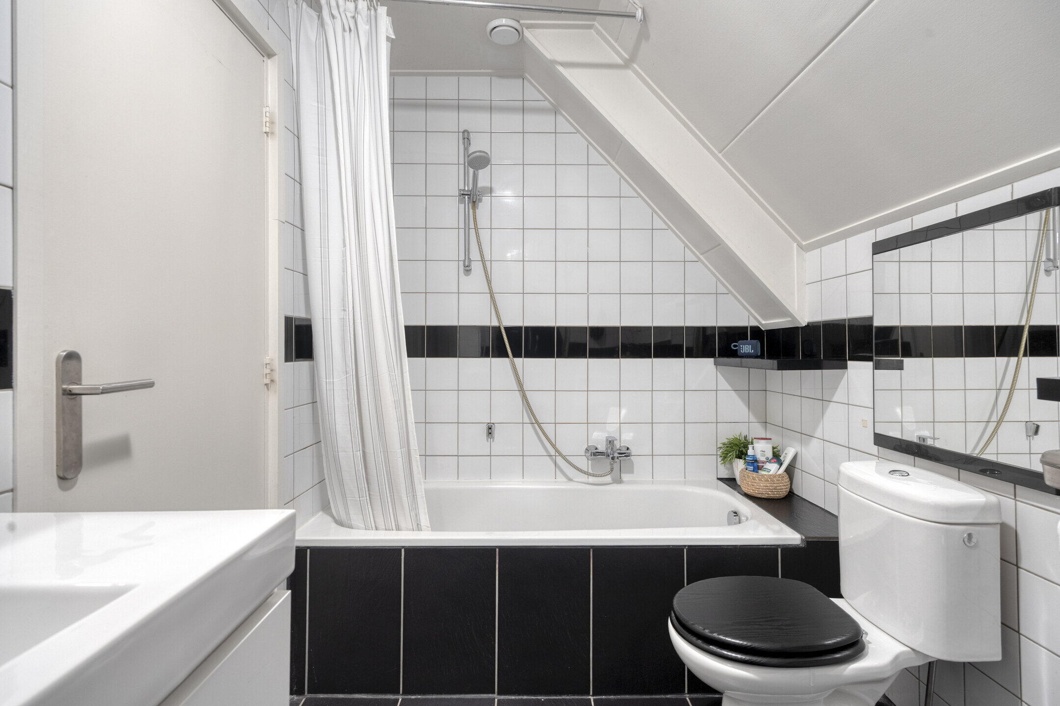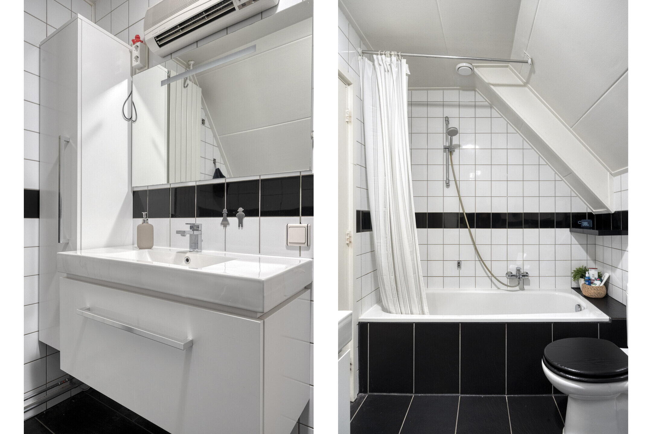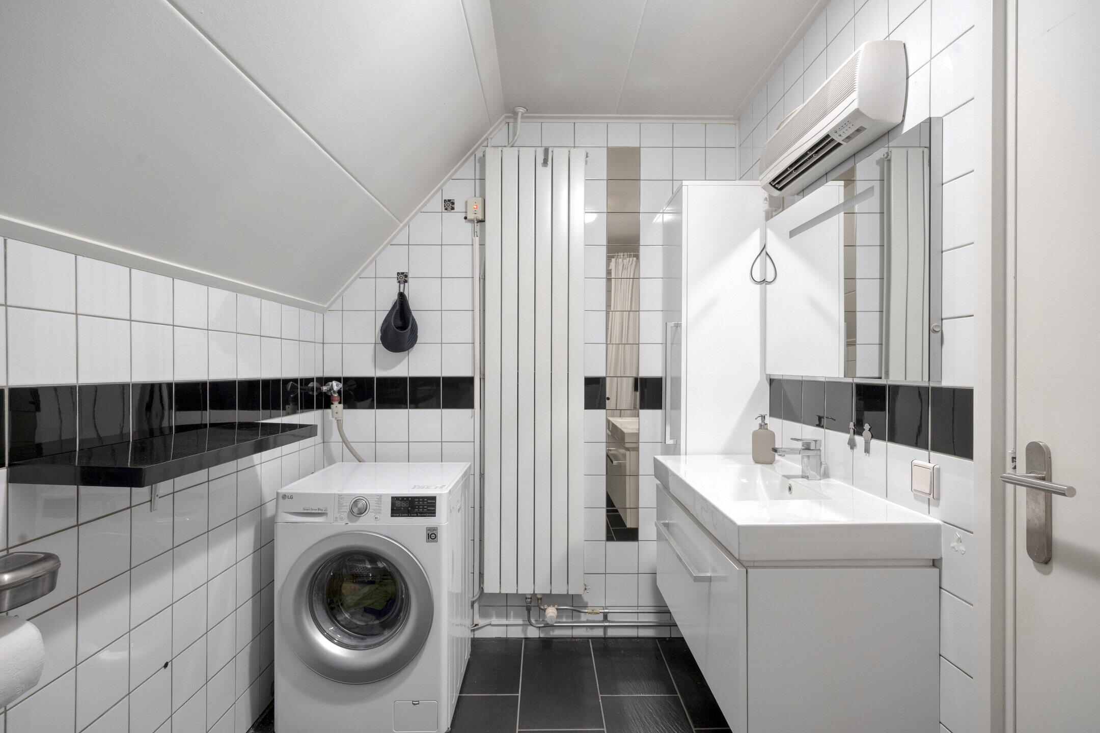 - Volledig betegelde badkamer (ca. 5,5 m²) v.v. vaste wastafel in badkamermeubel, ligbad, radiator en aansluiting voor de wasmachine;